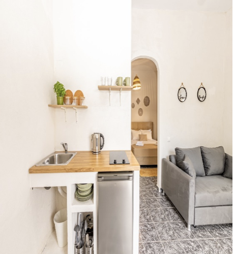 Дуплекс апартманот е со 2 спални соби, физички одделени од дневниот престој каде што се наоѓа комплетно опремена голема кујна.