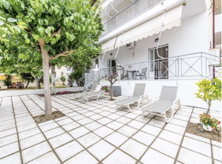 Вилата Скиони Апартмани се наоѓаат на самa плажа во Неа Скиони, со директен пристап на море. Опкружена е со прекрасен голем двор – тераса, кој е опремен со сопствени лежалки, комплет маси со столици и скара кои се на располагање само за гостите на вилата од трите